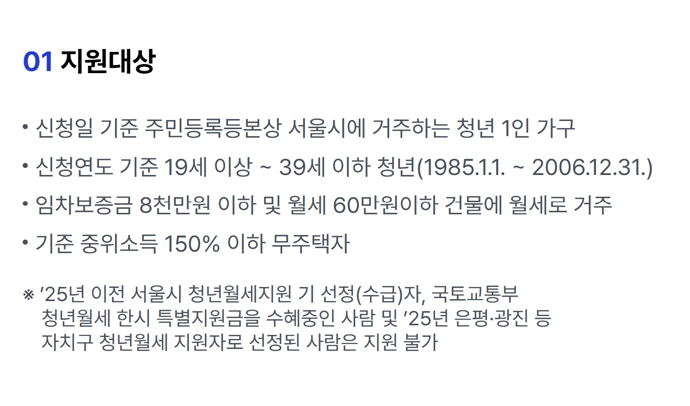 서울에 사는 청년들이 겪는 가장 큰 현실적 부담 중 하나는 ‘월세’입니다. 특히 대학 졸업 이후 또는 취업 초기 단계에서 독립해 생활하는 청년 1인 가구에게는 매달 나가는 월세가 고정지출이면서도 상당한 압박으로 작용합니다. 이러한 문제를 해소하고자 서울특별시에서는 『청년월세지원』 정책을 마련해 청년들의 주거비 부담 완화와 안정적 주거환경 마련에 나서고 있습니다. 본 포스팅에서는 2025년 기준 서울시 청년월세지원 사업의 지원 대상, 지원 내용, 신청 조건 및 방법, 선정 절차와 유의사항, 그리고 청년이 실제 활용할 때의 실전 팁까지 종합적으로 살펴보겠습니다.