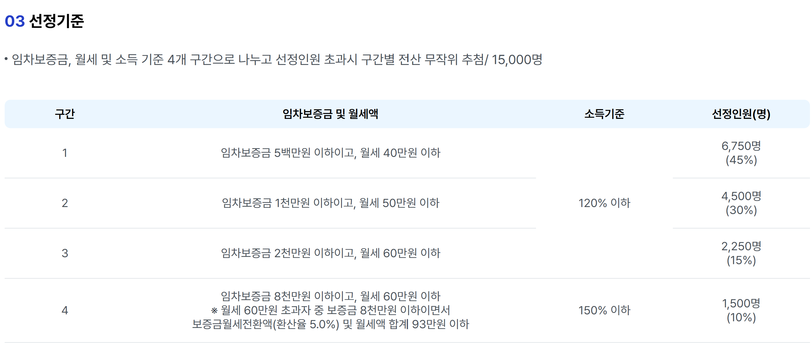 선정 방식: 임차보증금·월세·소득 기준 등을 고려하여 4개 구간으로 나눠 각 구간별 신청자가 모집인원을 초과할 경우 전산 무작위 추첨 방식으로 선정됩니다.
