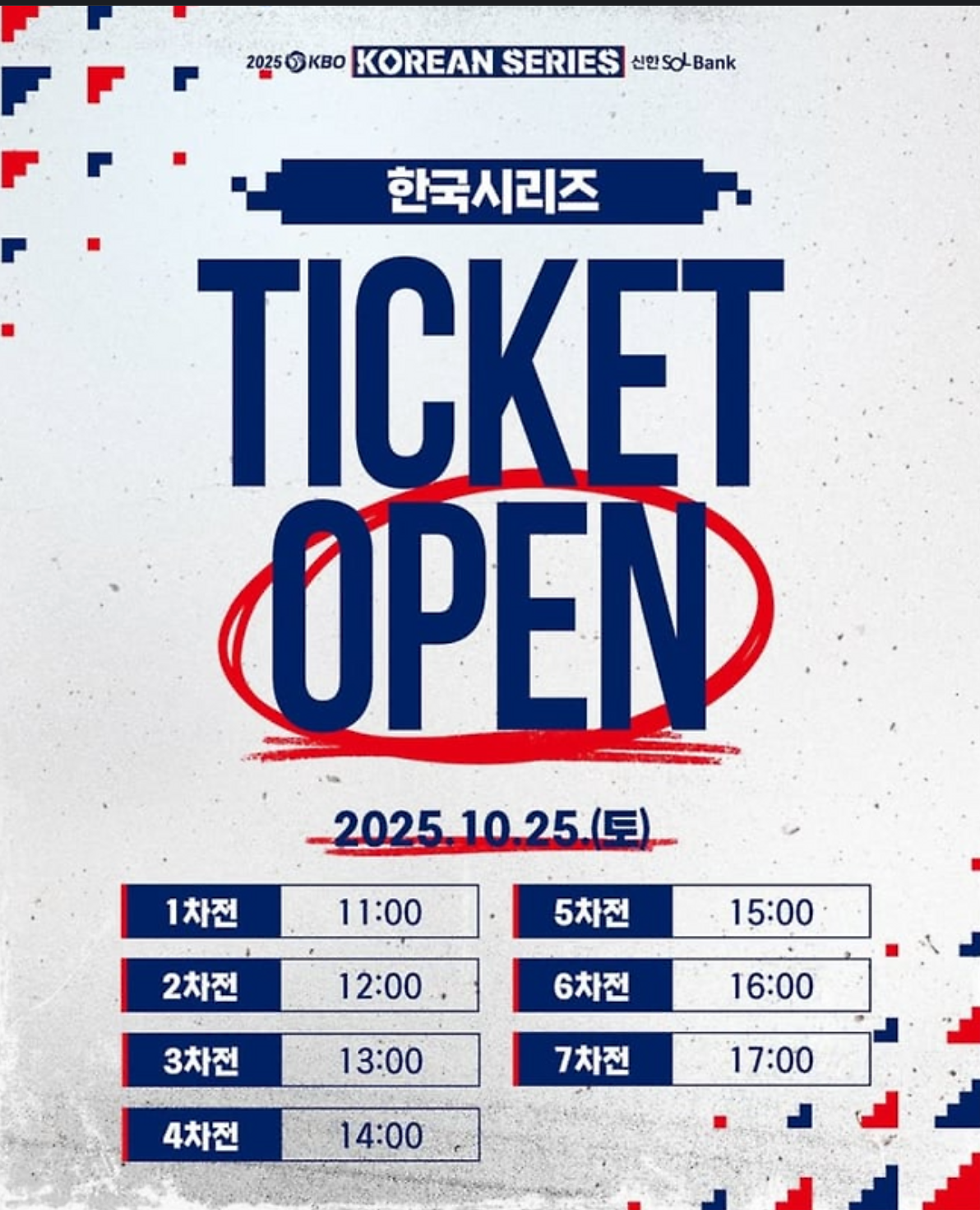 2025년 한국시리즈의 티켓 예매는 10월 25일 오전 11시부터 시작됩니다. 예매는 온라인을 통해 진행되며, 각 경기별로 순차적으로 오픈됩니다. 예를 들어, 1차전은 오전 11시, 2차전은 정오 12시부터 예매가 가능합니다.