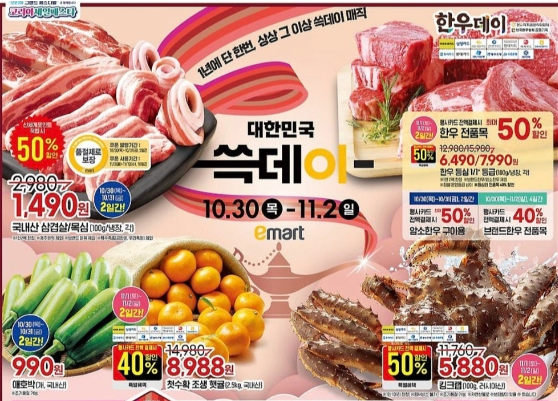 행사카드 결제 시 적용되며, 10/30~11/2 기간 내 브랜드한우 40% 할인,