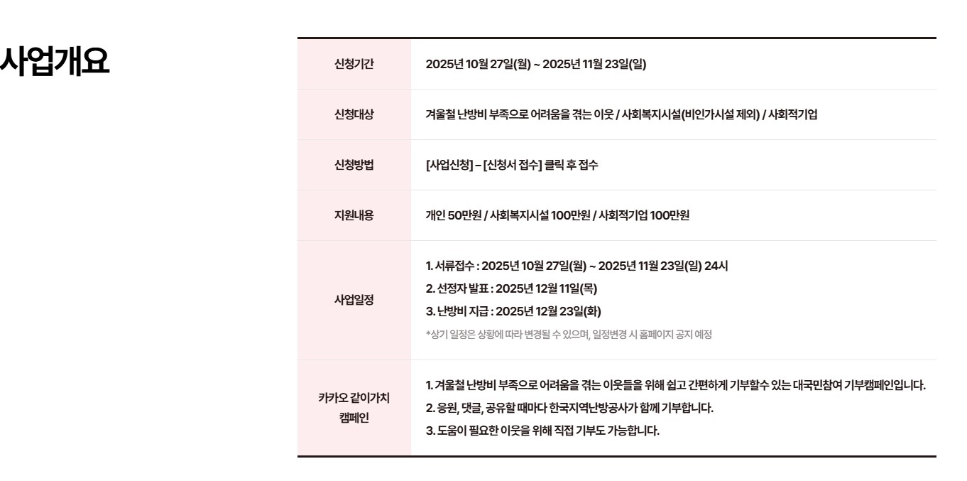 겨울철 난방비 마련이 곤란한 가구. 특히 저소득층, 고령 단독 가구, 장애인 가구 등이 핵심 대상입니다.